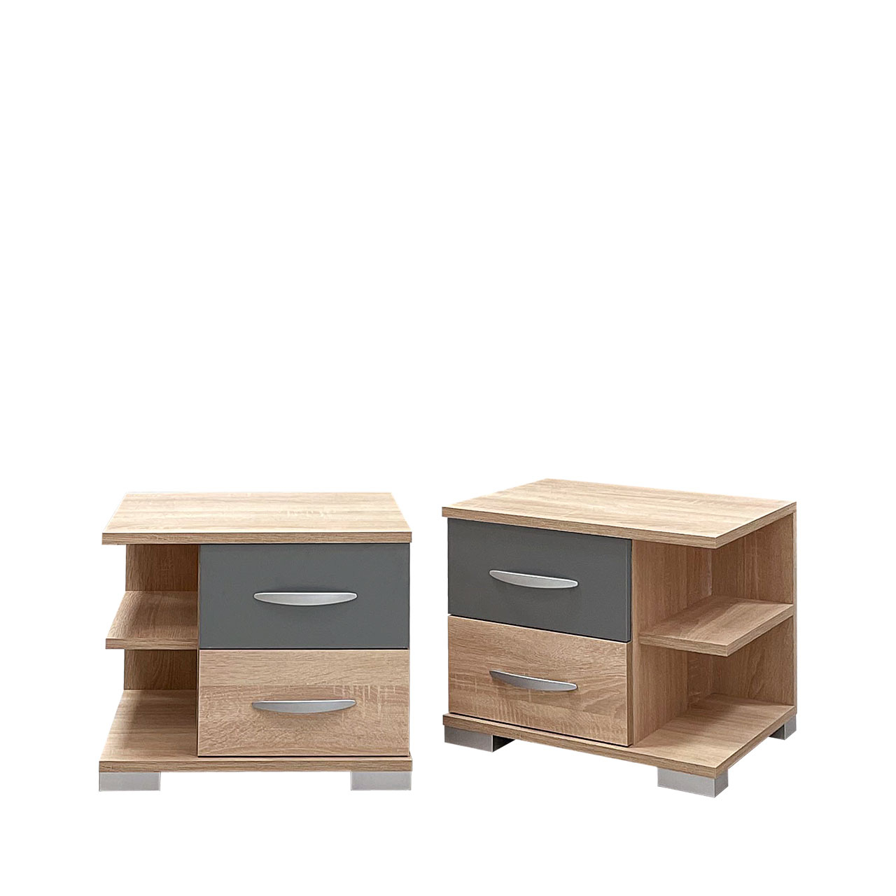 2 fiókos,polcos éjjeliszekrény 18 mm vastag bútorlapból. Tartósságát az éleken használt, hatékony ABS élfólia biztosítja. Maximális helykihasználást a 2 fiók és a nyitott polcrendszer biztosítja. (A fogók és a lábak változtatási jogát fenntartjuk.)Termékadatok: