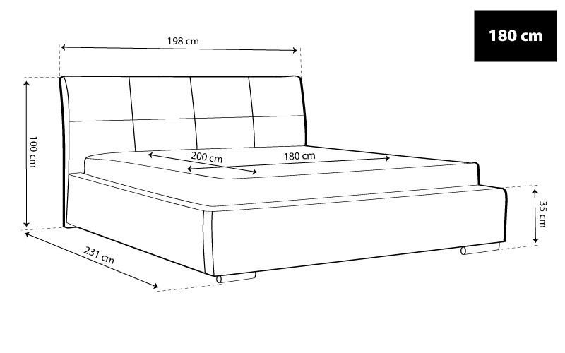 külső méret: 198 x 231 cm, fekvőfelület: 180 x 200 cm, oldalmagasság: 35 cm, magasság: 100 cm