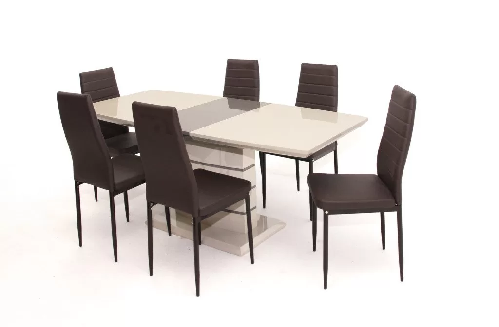 Az asztal lapja magas fényűre festett MDF, bővítése speciális billenő mechanikával és erős bovdenes vasalattal történik. A talp és a díszítő elemek anyaga szintén festett MDF. Összeszerelést igényel. Fehér/Szürke színben is  rendelhető. Méret: 70 x 140+(40) x 75,5 cm (Szélesség x Hosszúság x Magasság) Csomagolás : 1 db / 3 dobozFestett fém szerkezet, szövet kárpitozott hát és ülőlappal. Összeszerelést igényel. Méret: 97 x 49 x 42 x 42 cm (magasság x ülőfelület magasság x ülőfelület szélesség x ülőfelület mélység) Bruttó súly : 4,5 kg Csomagolás : 4 db/kartondoboz