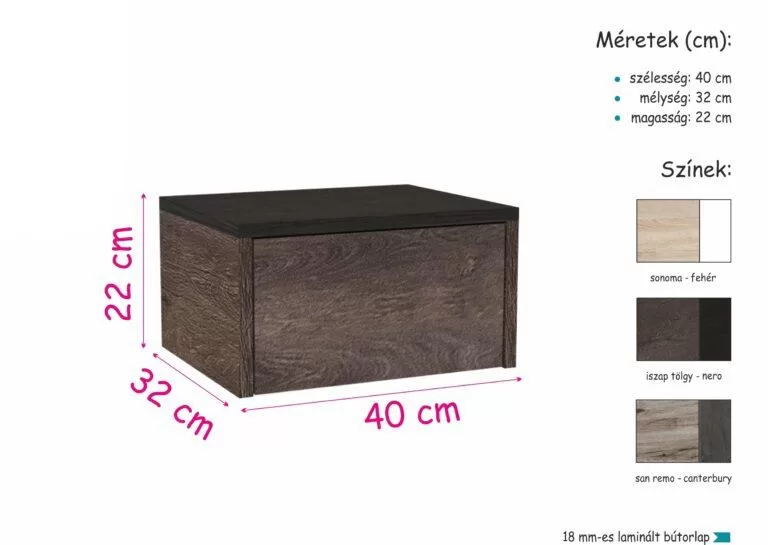 Minden hálószobában érdemes ügyelni arra, hogy legyen elég tárolásra alkalmas bútordarab. Az egyik legkedveltebb ilyen elem az éjjeliszekrény, ami ideális esetben nem hiányozhat egyetlen ágy mellől sem. Remek kiegészítő, hiszen sok apróságot elrejthet, ezért az ágykeret kiválasztása után érdemes hozzá illő éjjelit választani. Az éjjeliszekrény sonoma tölgy-rusztik fehér, san remo-canterbury és iszap tölgy-nero színkombinációban érhető el.Méret:szél/mag/mély: 40 / 22 / 32 cm