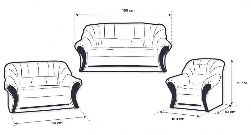 külső méret: 100 × 92 cm, háttámlamagasság: 91 cm, beülőmélység: 57 cm
