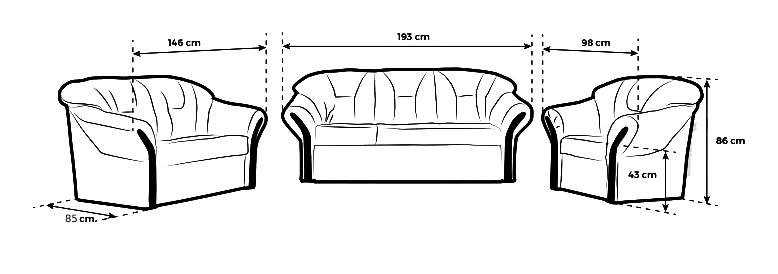 külső méret: 98 × 85 cm, ülőmagasság: 43 cm, beülőmélység: 56 cm, háttámlamagasság: 86 cm