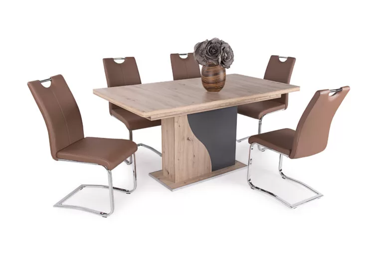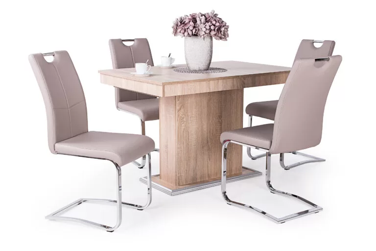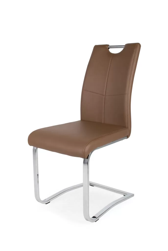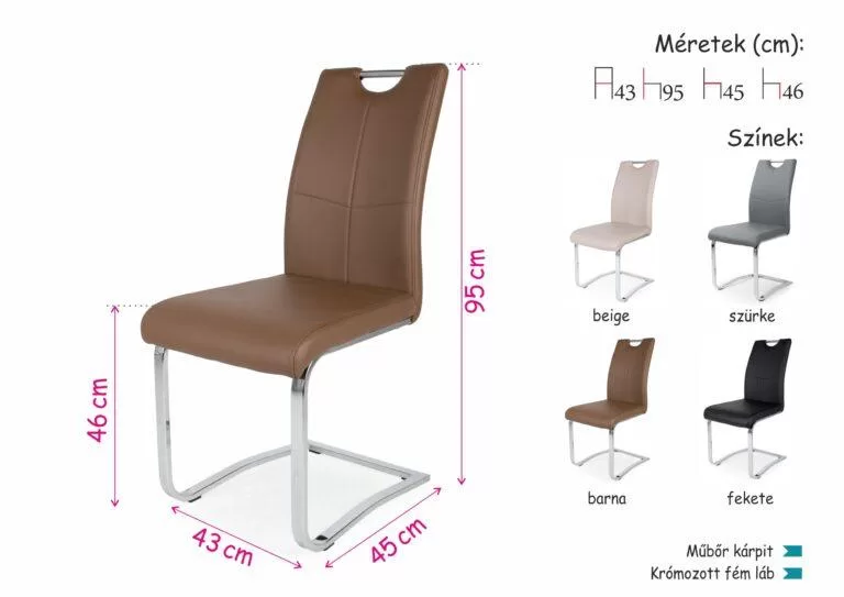 A szék krómozott fém lábaival és műbőr kárpitjával a modern stílusú otthonokba illik a legjobban. A kényelmes ülőfelület és háttámla ideális választás lehet mindazok számára, akik az étkezőben igényes bútorokat szeretnének elhelyezni. 4 különleges színben kapható: beige, szürke, barna és fekete.Méretek:ülőlap szélesség: 43 cm ülőlap mélység: 45 cm ülőlap magasság: 46 cm teljes magasság: 95 cm