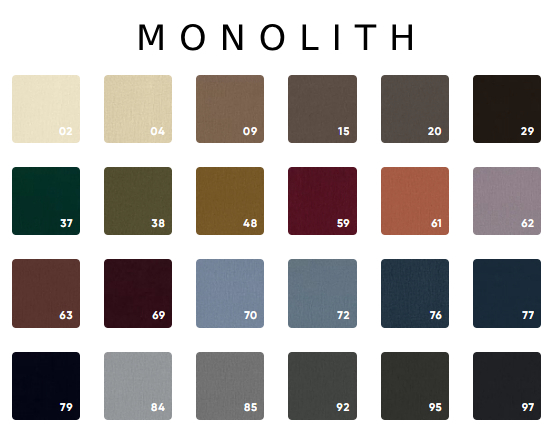 1. Monolith 84 A MONOLITH egy elegáns, bársony tapintású anyag. A szövet erős és vastag, kiemelkedő kopás- és fényállósággal. Vízlepergető technológiával készül, amely megnehezíti a folyadék felszívódását. Típus: Egyszínű, modern, bársony; Összetétel: 100% poliészter; Fényállóság: 4; Vízlepergető: igen; Kopásállóság (Martindale teszt): 100.000