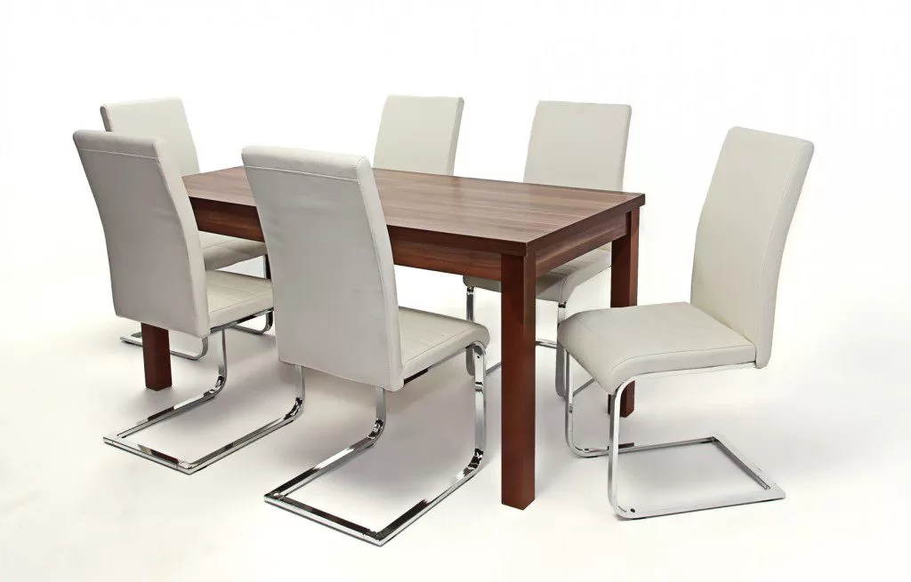Az asztallap egy oldalt laminált MDF. Pácolt, lakkozott tömörfa lábakkal. Nagyobbítás, fém vasalattal. Méret: 80 x 160+(40) x 75 cm (Szélesség x Hosszúság x Magasság) Bruttó súly : 43 kg Csomagolás : 1 db / 1 dobozKrómozott fém szerkezet, műbőr kárpitozott ülőlappal. Méret: 100 x 44 x 41 x 43 cm (magasság x ülőfelület magasság x ülőfelület szélesség x ülőfelület mélység) Bruttó súly : 8,3 kg Csomagolás : 4 db/kartondoboz