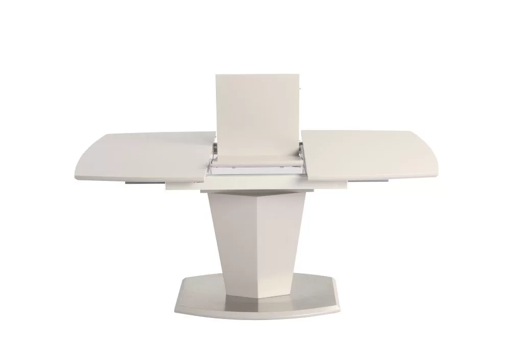 Az asztal lapja magas fényűre festett MDF, bővítése speciális billenő mechanikával és erős bovdenes vasalattal történik. A talp és a díszítő elemek anyaga szintén festett MDF. Összeszerelést igényel. Szürke/Fehér és Cappuccino/Beige színekben  rendelhető. Méret: 80×120+(40) x 76 cm (Szélesség x Hosszúság x Magasság) Bruttó súly : 52 kg Csomagolás: 1 asztal/ 3 karton