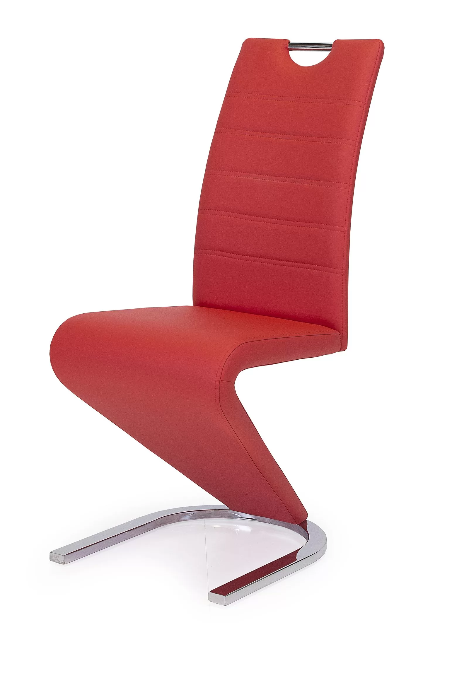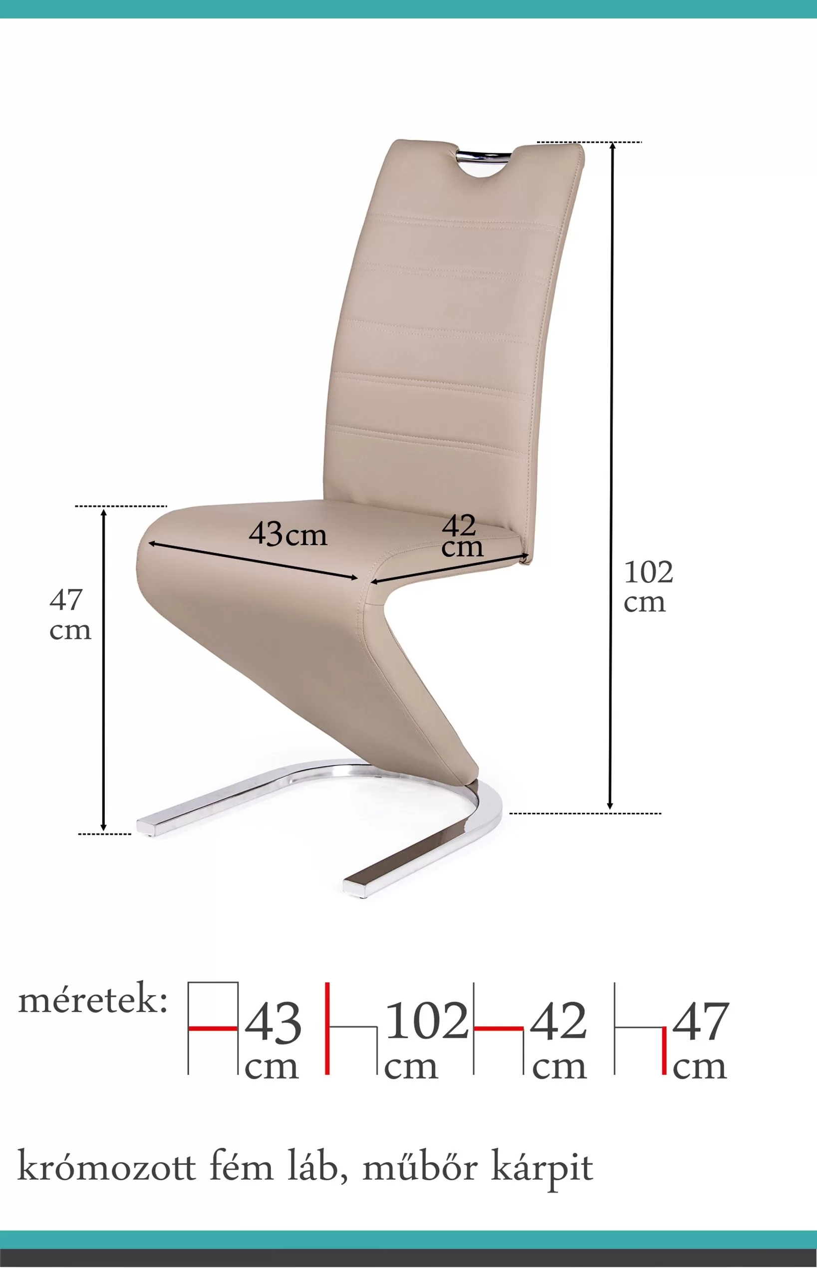 A szék egy igazán stílusos étkezőszék egyedi formával, króm lábazattal és könnyen tisztítható műbőr kárpittal. A bútordarab akár hagyományos akár modern asztalokhoz is kiválóan illik, mert különleges összképet teremt az étkezőben. Visszafogott beige és exclusive piros színekben.Méretek:ülőlap szélesség: 43 cm ülőlap mélység: 41 cm ülőlap magasság: 50 cm teljes magasság: 104 c