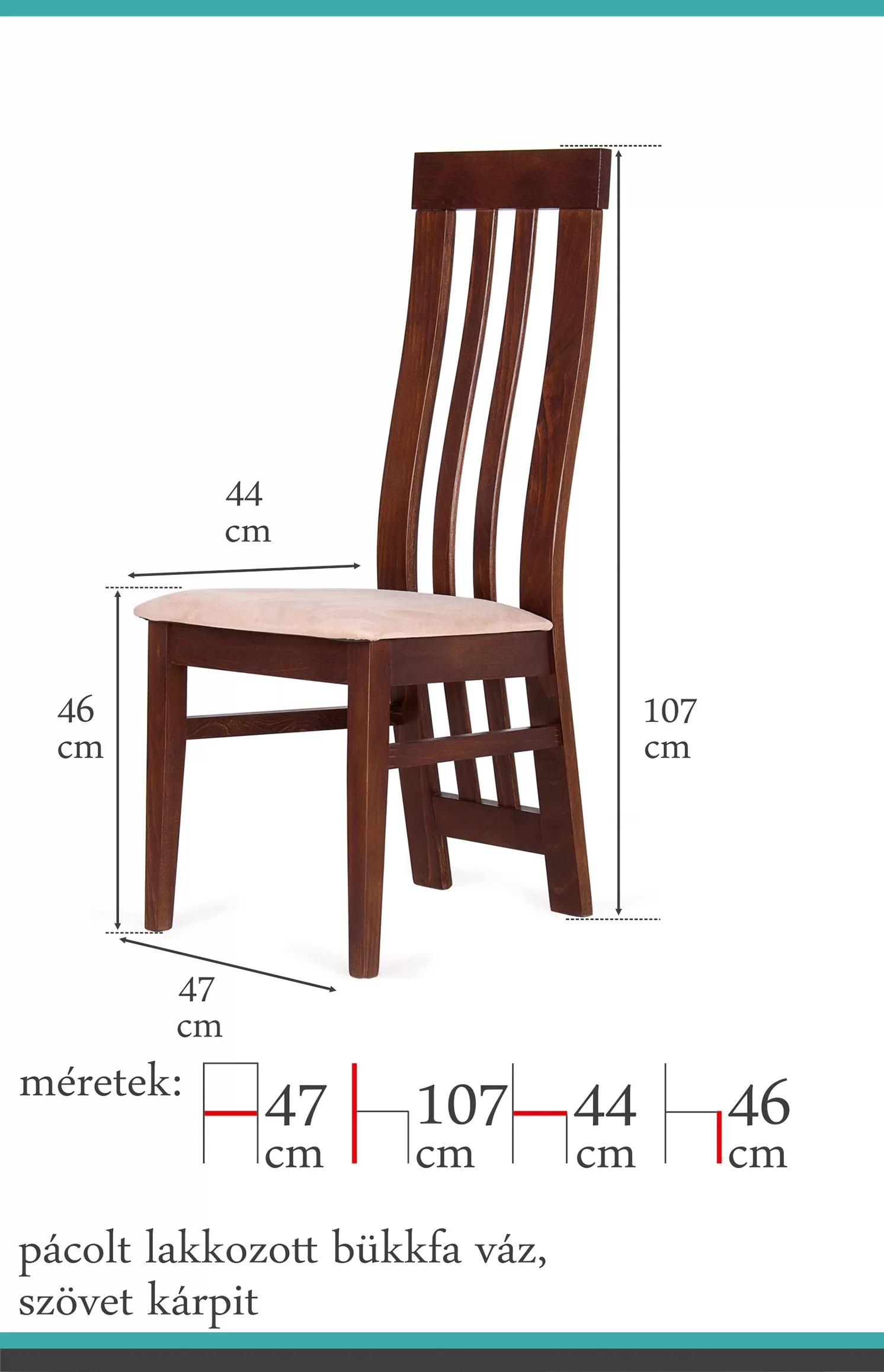A szövet kárpittal készült székek kiemelt népszerűségnek örvendenek. A szék pácolt lakkozott bükkfa vázzal és különleges vonalvezetésű háttámlájával kiválóan alkalmas a klasszikus stílust kedvelők otthonába. Három színvariációja érhető el: gesztenye váz -világosbarna szövet, wenge váz – fehér szövet, calwados váz – világossárga szövet.Méretek:ülőlap szélesség: 44 cm ülőlap mélység: 45 cm ülőlap magasság: 46 cm teljes magasság: 106 cm