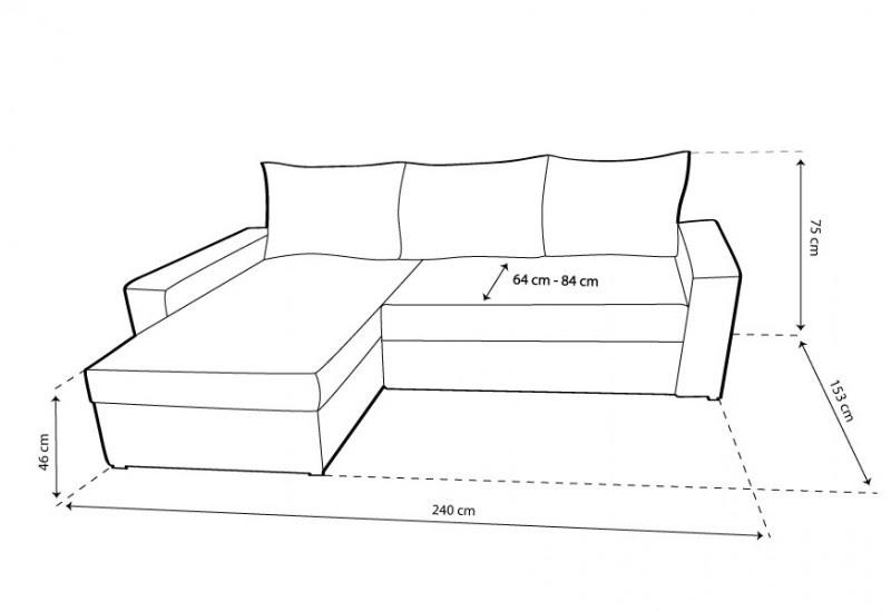 külső méret: 240 × 153 cm, fekvőfelület: 150 × 200 cm, ülőmagasság: 46 cm, beülőmélység (párnával): 64 cm, beülőmélység: 84 cm, háttámlamagasság: 75 cm