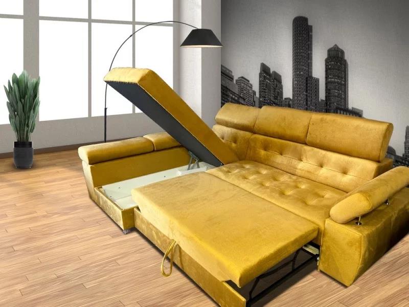 magas fekhelyes, jobbos-balos állásban rendelhető, hátulja szövettel bevonva, kiemelő mechanika, hullámrugós, szövet, ágyazható, ágyneműtartós, állítható fejtámla, állítható kartámla, 250 – 300 cm szélesség között