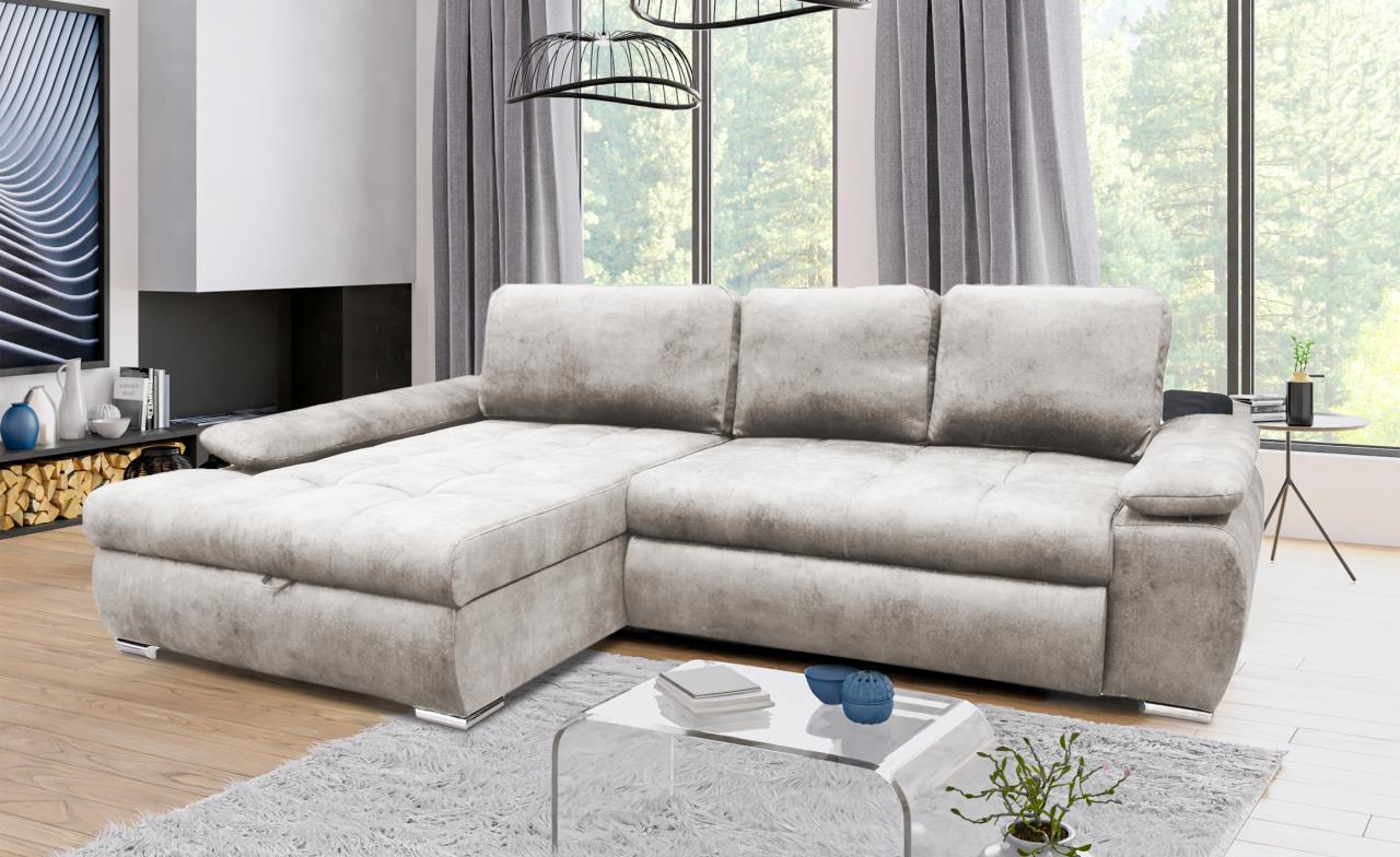 magas fekhelyes, jobbos-balos állásban rendelhető, hátulja szövettel bevonva, kiemelő mechanika, hullámrugós, szövet, ágyazható, ágyneműtartós, állítható kartámla, 250 – 300 cm szélesség között
