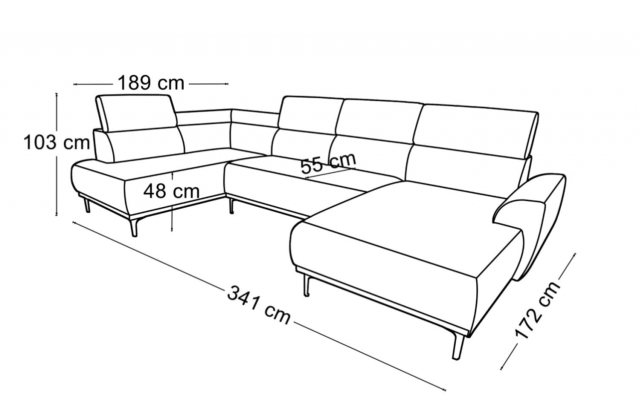 külső méret: 342 cm x 202 x 178 cm, fekvőfelület: 276 cm x 85 cm, ülőmagasság: 50 cm, beülőmélység: 60-85 cm, magasság: 108 cm