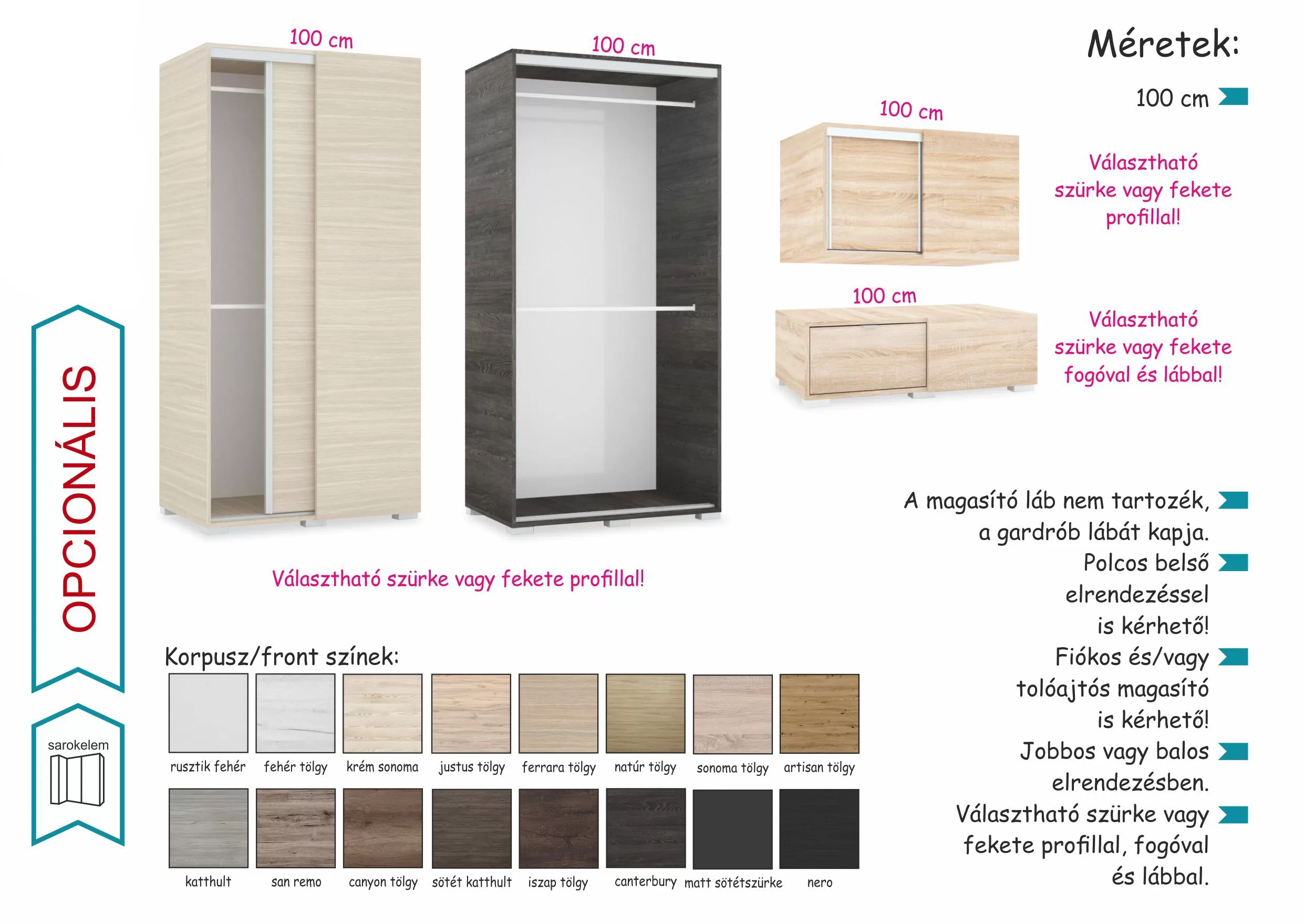 Tolóajtós sarokelemeink tökéletes helykihasználást tesznek lehetővé. Az alap kivitel bútorlapos, mándlirúdas belsővel készül, de opcionálisan rendelhető hozzá polc is. Tolóajtós sarokelemeink az alábbi gardróbjainknál a front mintáját követik: Porto gardrób, Borneo gardrób, Lux gardrób, Magasfényű front, Magasfényű betét.Méret:szél/mag/mély: 100 / 203 / 60 cm