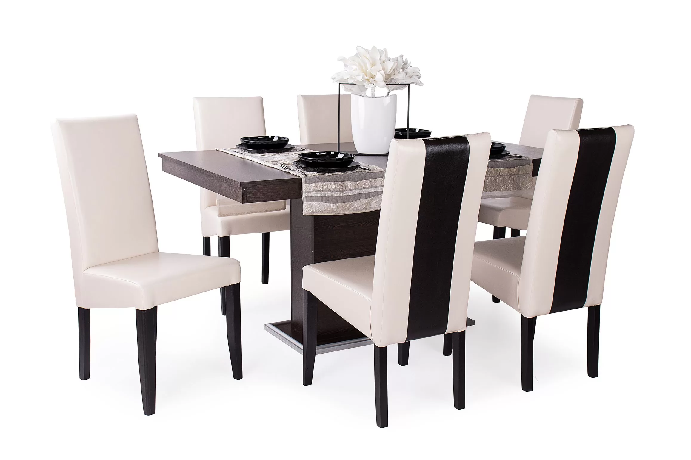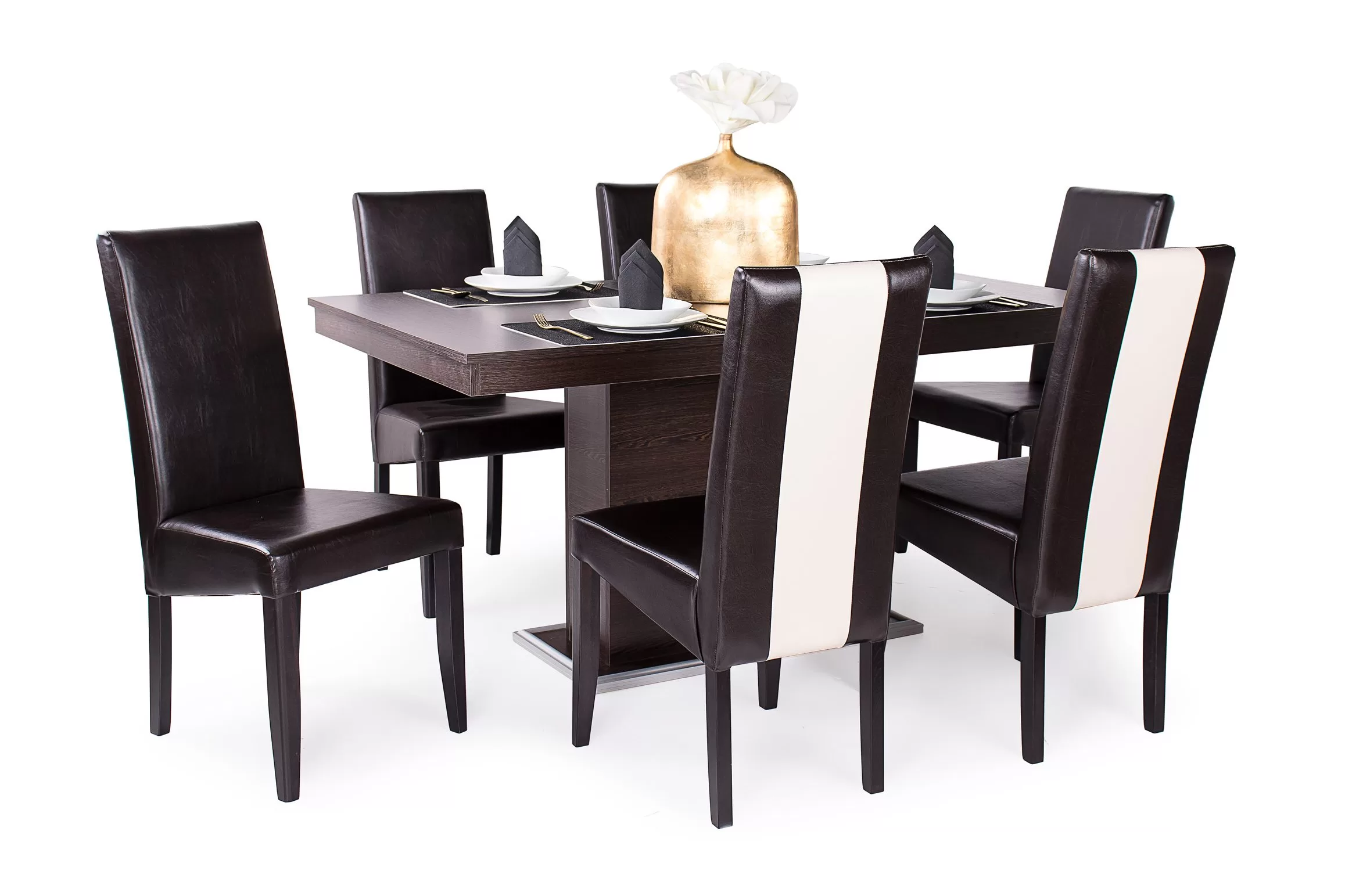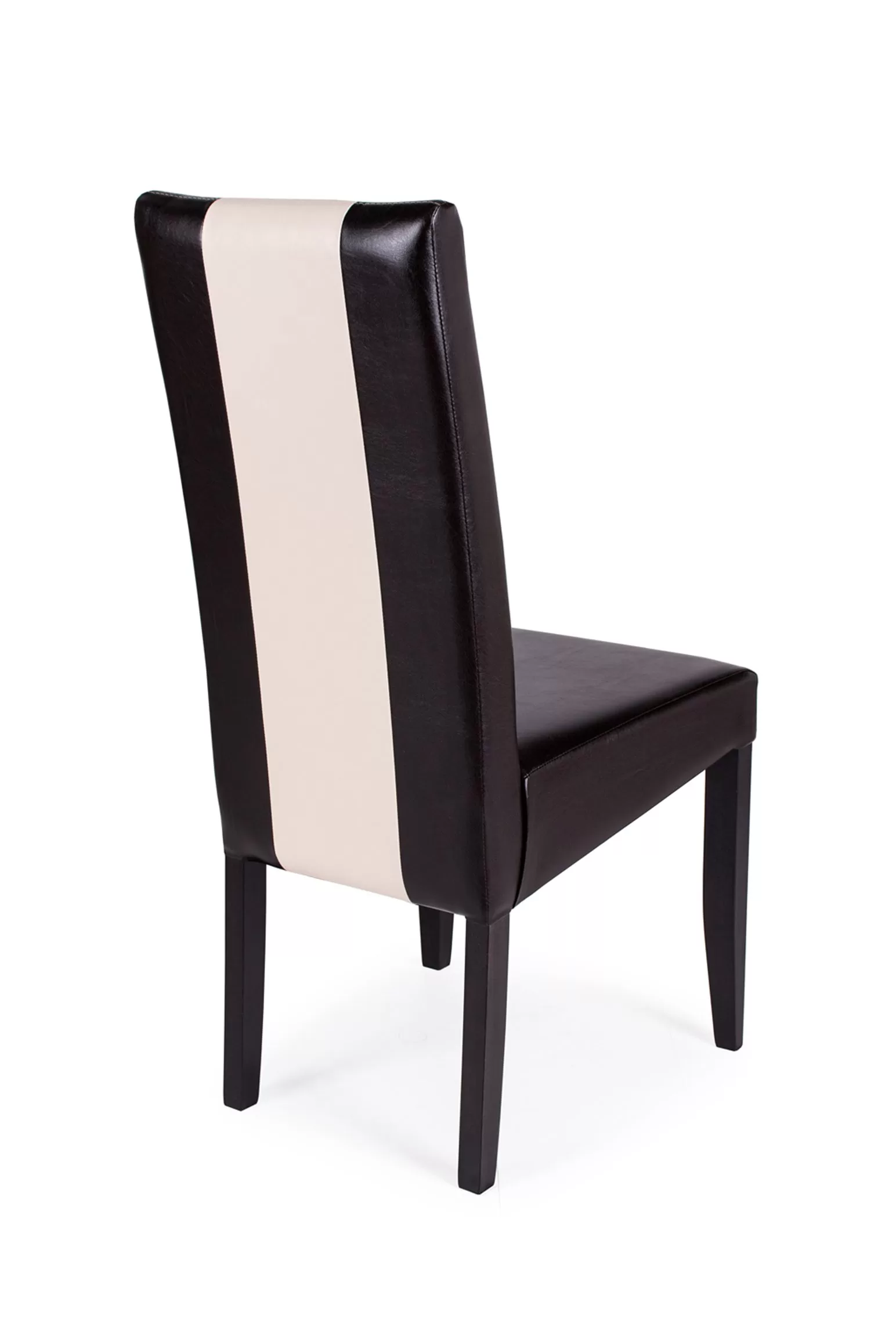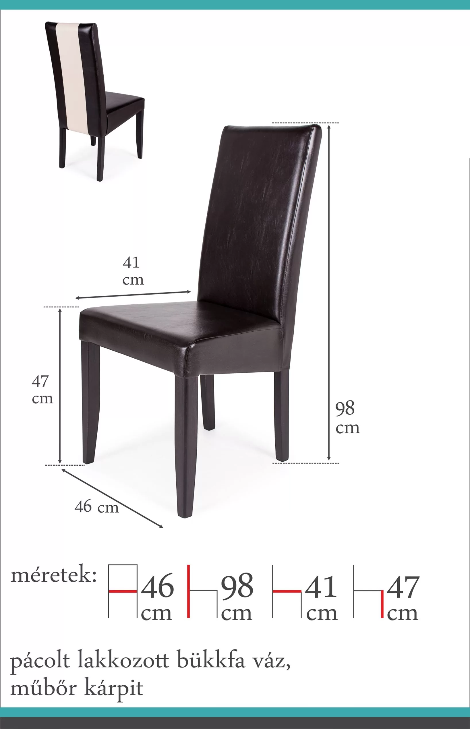 A széket a többi, megjelenésében hasonlító székünkhöz hasonlóan pácolt, lakozott bükkfa váz és kényelmes műbőr kárpit jellemzi. A különlegessége a kárpit csíkozásában rejlik, ami igazán stílusossá és modernné teszi. Színei a klasszikus barna – beige csíkkal, és a kellemes beige – barna csíkkal.Méretek:ülőlap szélesség: 47 cm ülőlap mélység: 41 cm ülőlap magasság: 47 cm teljes magasság: 98 cm