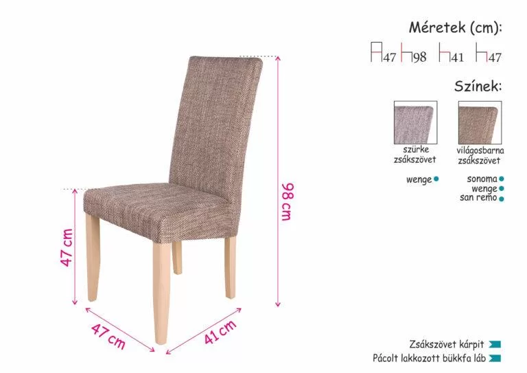 A zsákszövet használata minden korábbinál divatosabbnak számít. Nem véletlen, hogy a szék kárpitozásán is visszaköszön. Stílusos, mégis egyszerű megjelenésénél fogva a bútor kiválóan passzol a modern és a hagyományos lakberendezési irányzathoz is. A pácolt lakkozott bükkfa láb a fa természetességével teszi stílusossá az étkezőt.Méretek:ülőlap szélesség: 47 cm ülőlap mélység: 41 cm ülőlap magasság: 47 cm teljes magasság: 98 cm