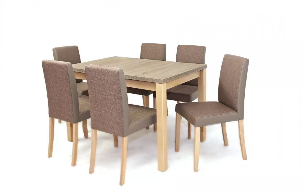 Az asztallap laminált faforgácslap ABS élzárással, a lábazat és a káva szerkezet festett és lakkozott tömörfa. Nagyobbítás, fém vasalattal. Méret: 80 x 120+(40) x 74 cm (Szélesség x Hosszúság x Magasság) Bruttó súly : 37,9 kg Csomagolás : 1 db / 2 dobozTömörfa szerkezet pácolva, lakkozva, magas minőségű szövet kárpitozással. Méret: 90 x 46 x 45 x 41 cm (magasság x ülőfelület magasság x ülőfelület szélesség x ülőfelület mélység) Bruttó súly : 5,9 kg Csomagolás : 2 db/kartondoboz