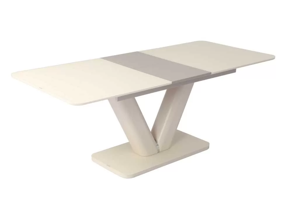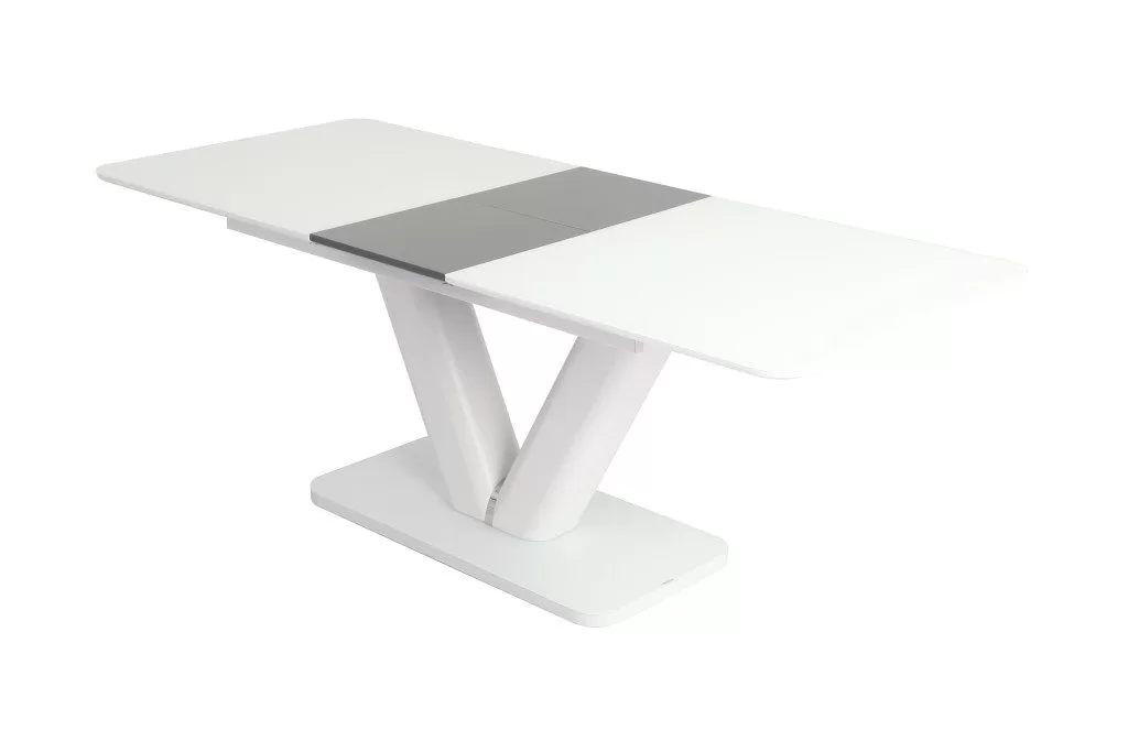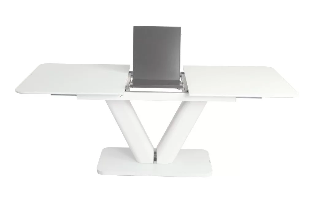 Az asztal lapja matt festett MDF melyet edzett üveg fedtek, bővítése speciális billenő mechanikával és erős bovdenes vasalattal történik. A lábazat anyaga szintén matt festett MDF fém díszítő elemmel. A talp rész szintén edzett üveggel van fedve. Összeszerelést igényel. Fehér/Szürke és Beig/Cappuccino színekben raktárról rendelhető. Méret: 90×160+(40) x 76 cm (Szélesség x Hosszúság x Magasság) Bruttó súly : 97 kg Csomagolás: 1 asztal/ 3 karton